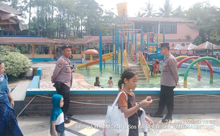 LEBAK Benuanewsbanten.com ,-Menjaga kondusifitas dan keamanan di Wilayah Hukum Polsek Rangaksbitung, anggota Polsek Rangkasbitung BRIPKA H.Ramdani dan BRIGPOL Riki Andriana, melaksanakan giat monitoring ke wisata air kolam renang Bina Insani Mandiri (BIM) sekaligus edukasi kamtibmas Kepada para pengunjung.