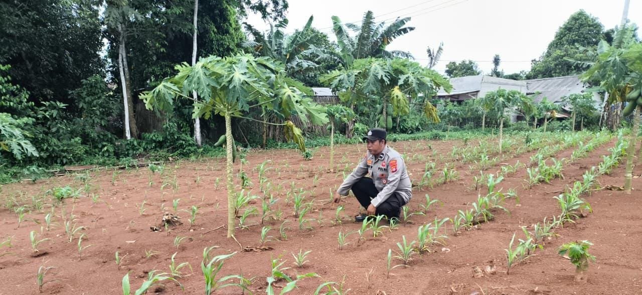 LEBAK Benuanewsbanten.com Mendukung program Ketahanan Pangan,Bhabinkamtibmas Polsek Rangkasbitung Polres Lebak,AIPDA Turas Catur,cek bibit pohon jagung dan bersihkan rumput liar disekitaran pohon Jagung hibrida.