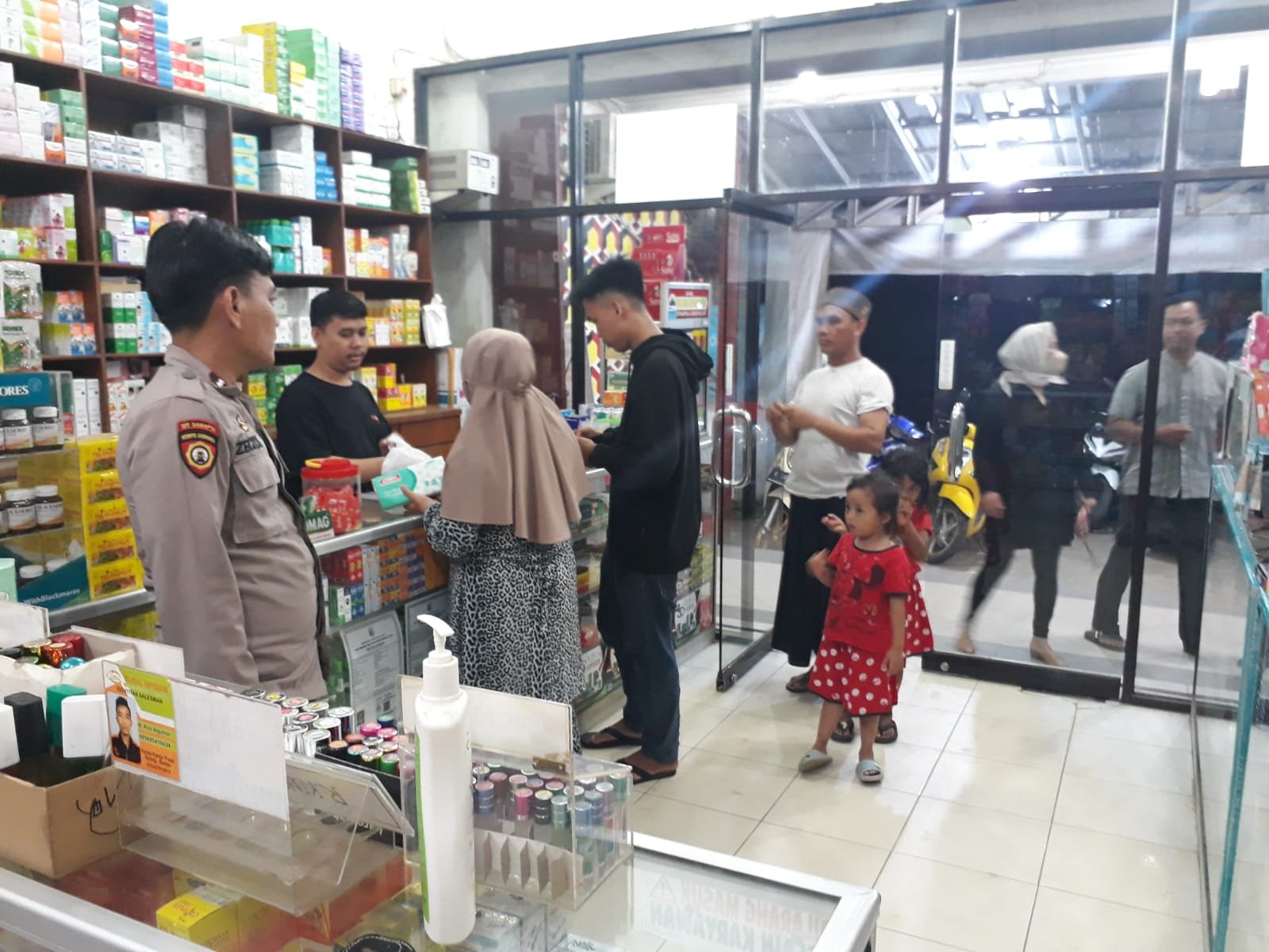 LEBAK, Benuanewsbanten.com -Bhabinkamtibmas Polsek Wanasalam Polres Lebak Bripka Yayan. W dan Briptu Rendi monitoring kegiatan warga masyarakat yang sedang membeli obat-obatan, untuk memantau situasi Kamtibmas di seputaran lokasi pertokoan seperti apotek/toko obat di pasar Binuangeun Kecamatan Wanasalam, agar tdk terjadi tindak kejahatan, juga mengingatkan kepada apoteker agar selalu cek masa berlakunya obat-obatan yang di jual, jangan sudah kadaluwarsa masih d jual, selalu d cek masa berlakunya. Senin malam (29/05/2023). Pukul 20.00 Wib.
