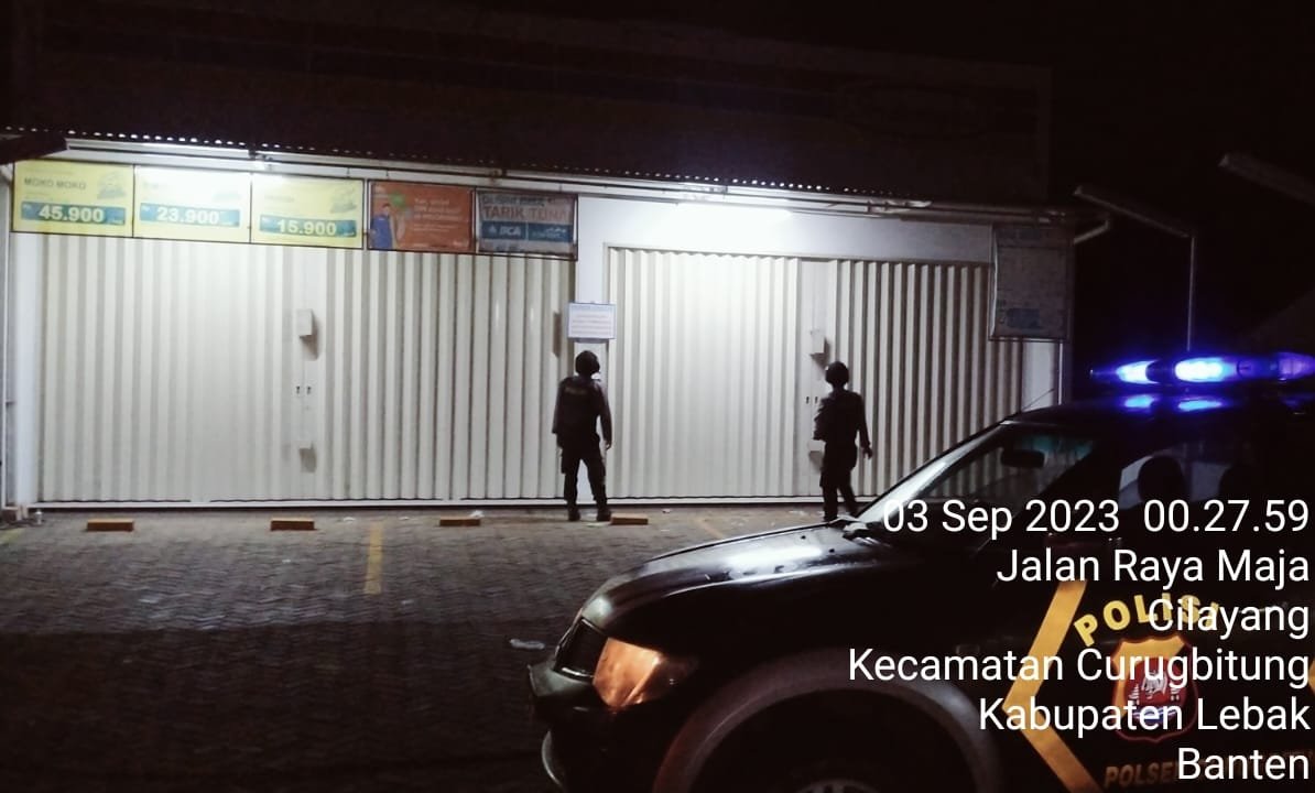 LEBAK Benuanewsbanten.com, Guna mencegah aksi pembobolan di minimarket, personil Polsek Curugbitung Polres Lebak laksanakan patroli waralaba ke toko Indomaret yang berada di desa Cilayang, Kecamatan Curugbitung, Kabupaten Lebak, Provinsi Banten. Minggu (03/09/2023).