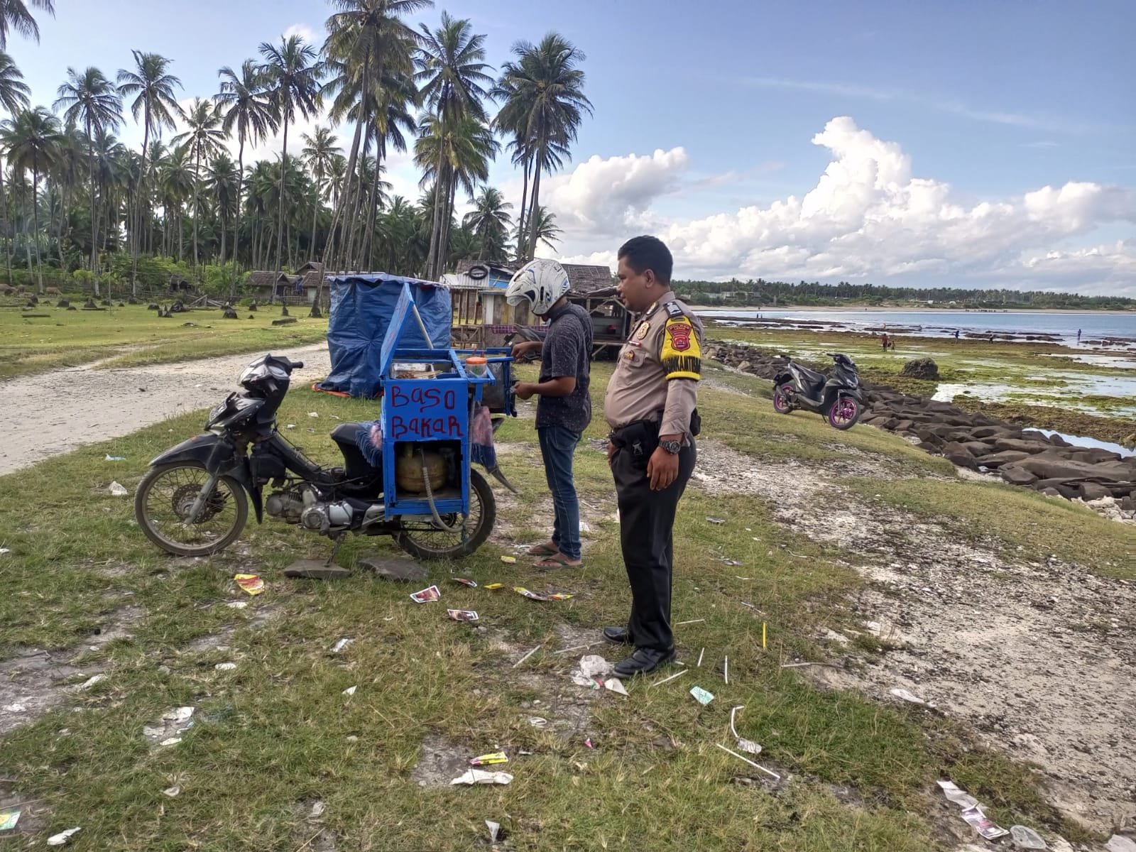 Bripka Suharta melaksanakan giat Patroli menyisir kawasan Pantai Tanjung Panto guna memastikan keamanan dan keselamatan pengunjung yang ada di sekitar Kawasan pantai agar berhati-hati dan melarang pengunjung berenang karena kawasan pantai Tanjung Panto tidak bisa di pakai berenang.