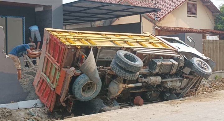 ujen salah satu pekerja dirumah yang temboknya terhantam truk mengatakan, kejadian tersebut terjadi sekira pukul 15.00 sore, alasan pengemudi truk terguling bahwa dibagian stir mobil diduga mengalami masalah, sehingga membuat truk terguling digalian proyek pelebaran jalan dan menghantam rumah warga.