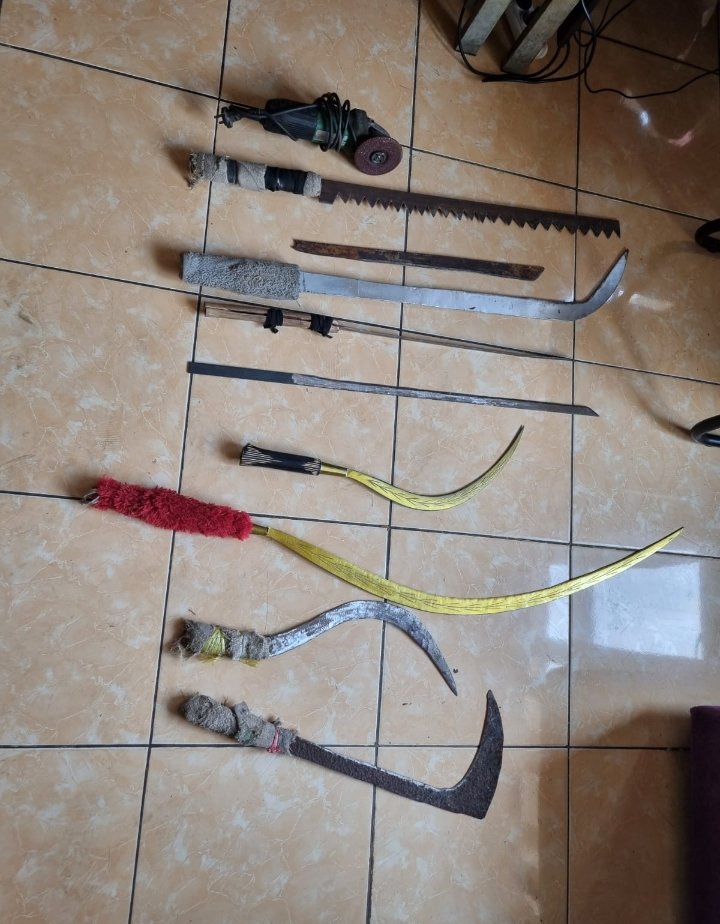 Clurit 5 (lima) buah,Pedang 3 (tiga) buah,Pedang gerigi 1 (satu)