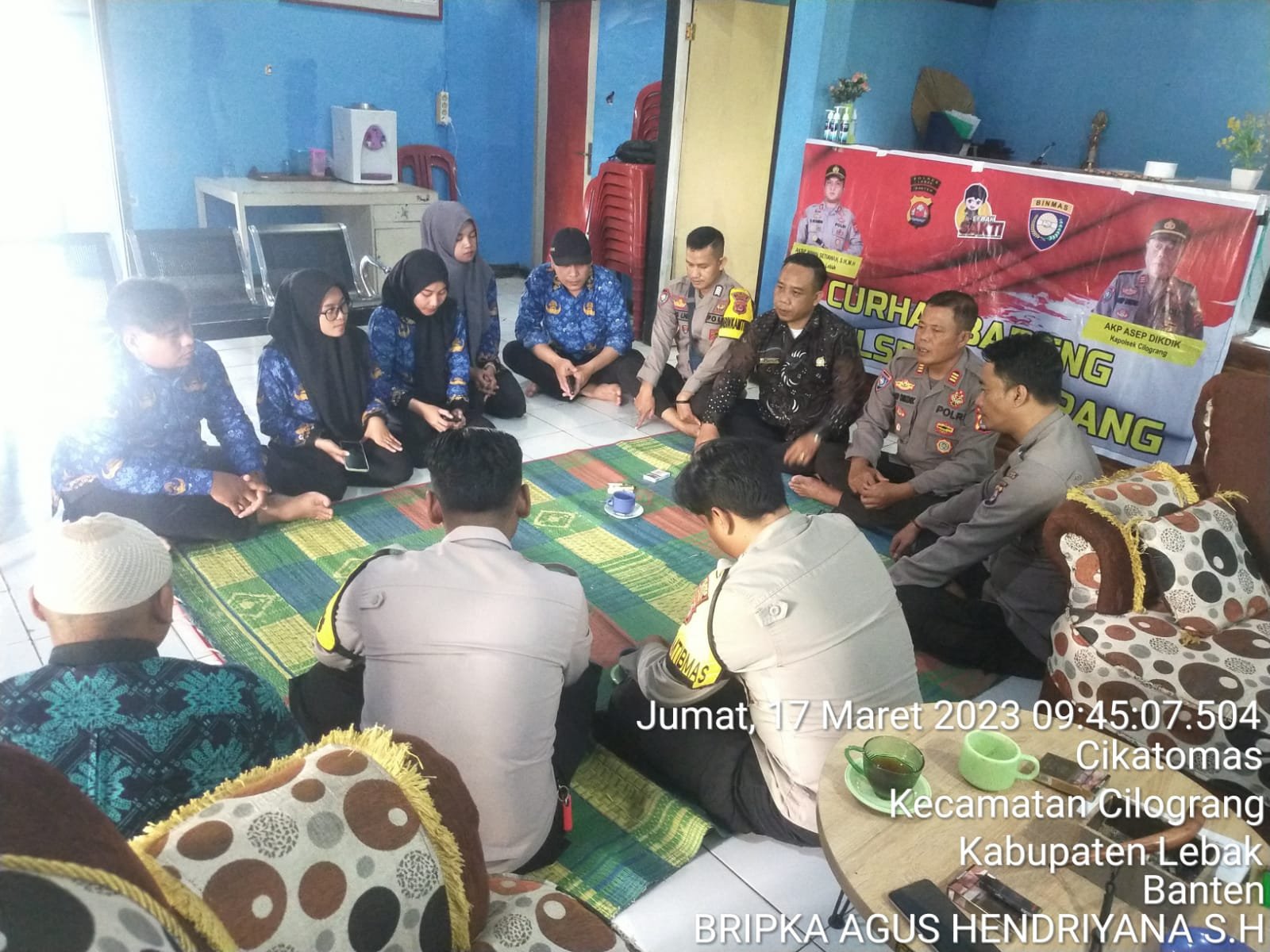 LEBAK Benuanewsbanten.com || Kapolsek Cilograng Polres Lebak AKP Asep Dikdik, bersama Bhabinmas Polsek Cilograng Polres Lebak melaksanakan program Jum’at Curhat Presisi Polri, giat Jum’at Curhat kepada masyarakat di Ds. Cikatomas untuk memberikan arahan, himbauan Kamtibmas Dan mendengarkan Curhatan dari Masyarakat.Jum’at(17/03/2023).