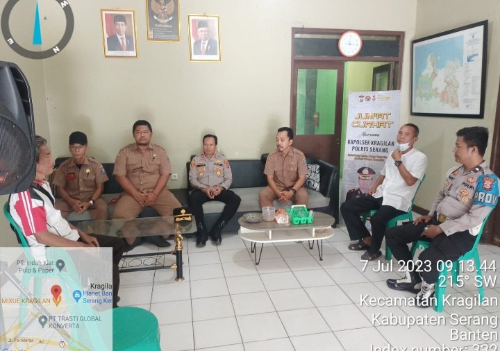 Kragilan Benuanewsbanten.com Polsek Kragilan Polres Serang melaksanakan silaturahmi Kamtibmas bersama Masyarakat bertempat di Desa Kragilan Kecamatan Kragilan Kabupaten Serang. sekaligus mengenalkan Program Polri Presisi Yaitu Jumat’Curhat. Jum’at, (07/07/2023). Pukul 09.00 WIB. s/d Selesai.