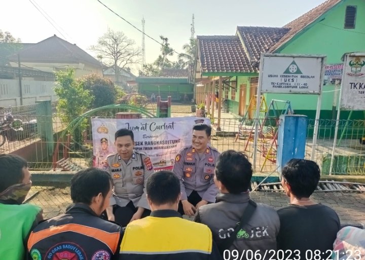 LEBAK Benuanewsbanten.com ,-Kapolsek Rangkasbitung AKP Pipih Iwan Hermansyah.SH,di dampingi Bhabinkamtibmas Polsek Rangkasbitung BRIGADIR Imam Soluchin,melaksanakan kegiatan Program Quick Wins Presisi Kapolri yaitu”Jumat Curhat”untuk menerima masukan dan keluhan dari kominitas Ojek online (Ojol) di Jalan Hardiwinangun, Kelurahan Muara Ciujung Timur,Kecamatan Rangkasbitung, Kabupaten Lebak. Jumat (09/06/2023)