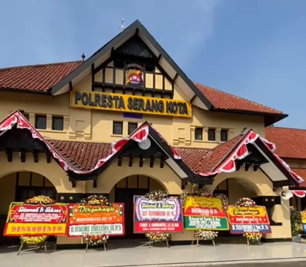 POLRESTA SERKOT Benuanewsbanten.com- Karangan bunga ucapan Hari Ulang Tahun (HUT) Bhayangkara Ke-76 penuhi halaman Mapolresta Serang Kota Polda Banten, Jumat (01/07)
