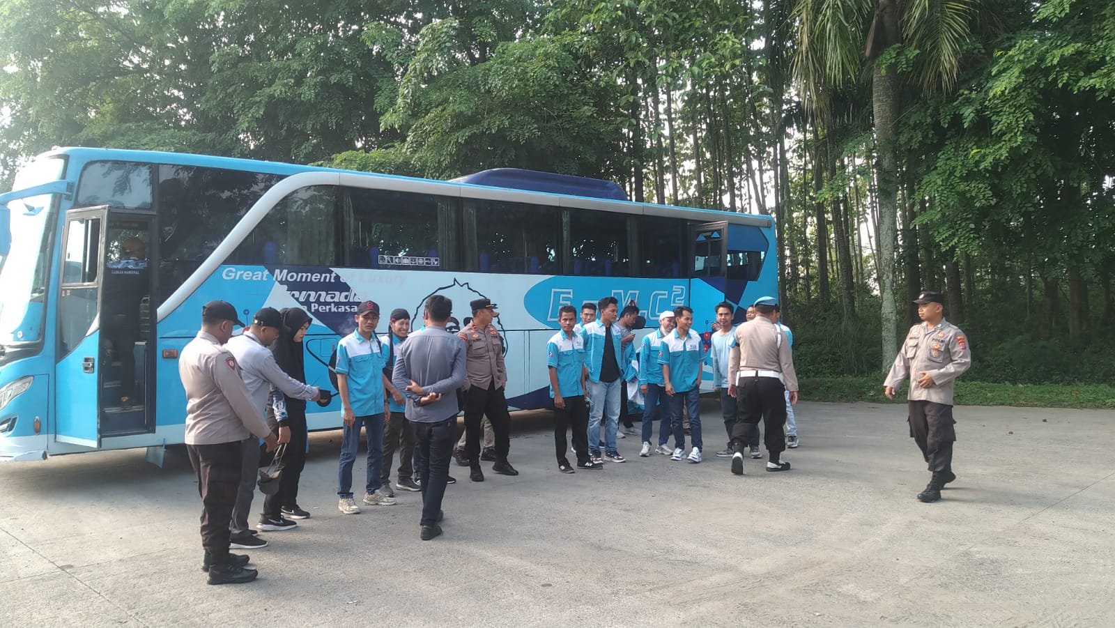Tampak personel yang terlibat dalam pengamanan di lokasi titik kumpul berkoordinasi dengan buruh sekaligus pengamanan hingga pemberangkatan.