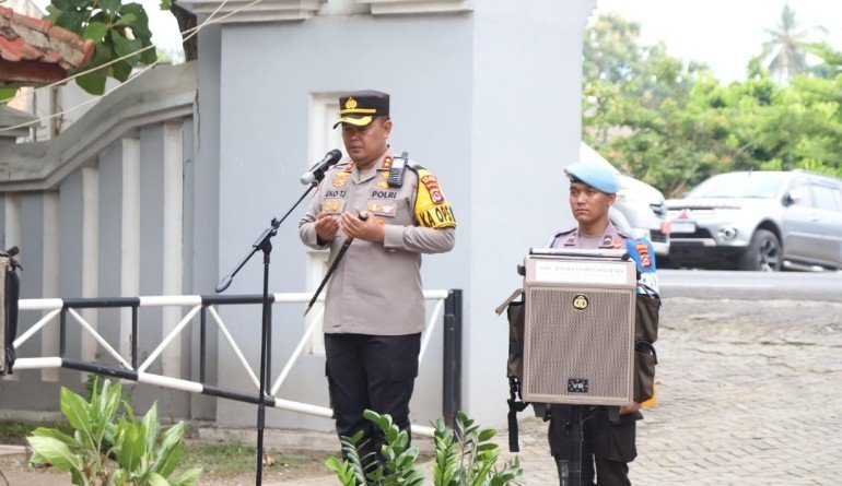 kita memanjatkan puji syukur kehadirat Allah SWT, tuhan yang maha esa, karena atas limpahan taufik rahmat dan hidayah-nya, sehingga pada hari ini kita masih diberikan kesehatan, kekuatan dan kesempatan untuk melaksanakan apel pergeseran pasukan pengamanan arus wisata pada libur lebaran tahun 2024 di daerah hukum Polres Cilegon dan kami mengucapkan selamat hari raya idul fitri 1445 H, mohon maaf lahir dan batin. Semoga kita senantiasa diberkahi dengan kebahagiaan dan kedamaian serta semoga amal ibadah kita diterima oleh Allah SWT.