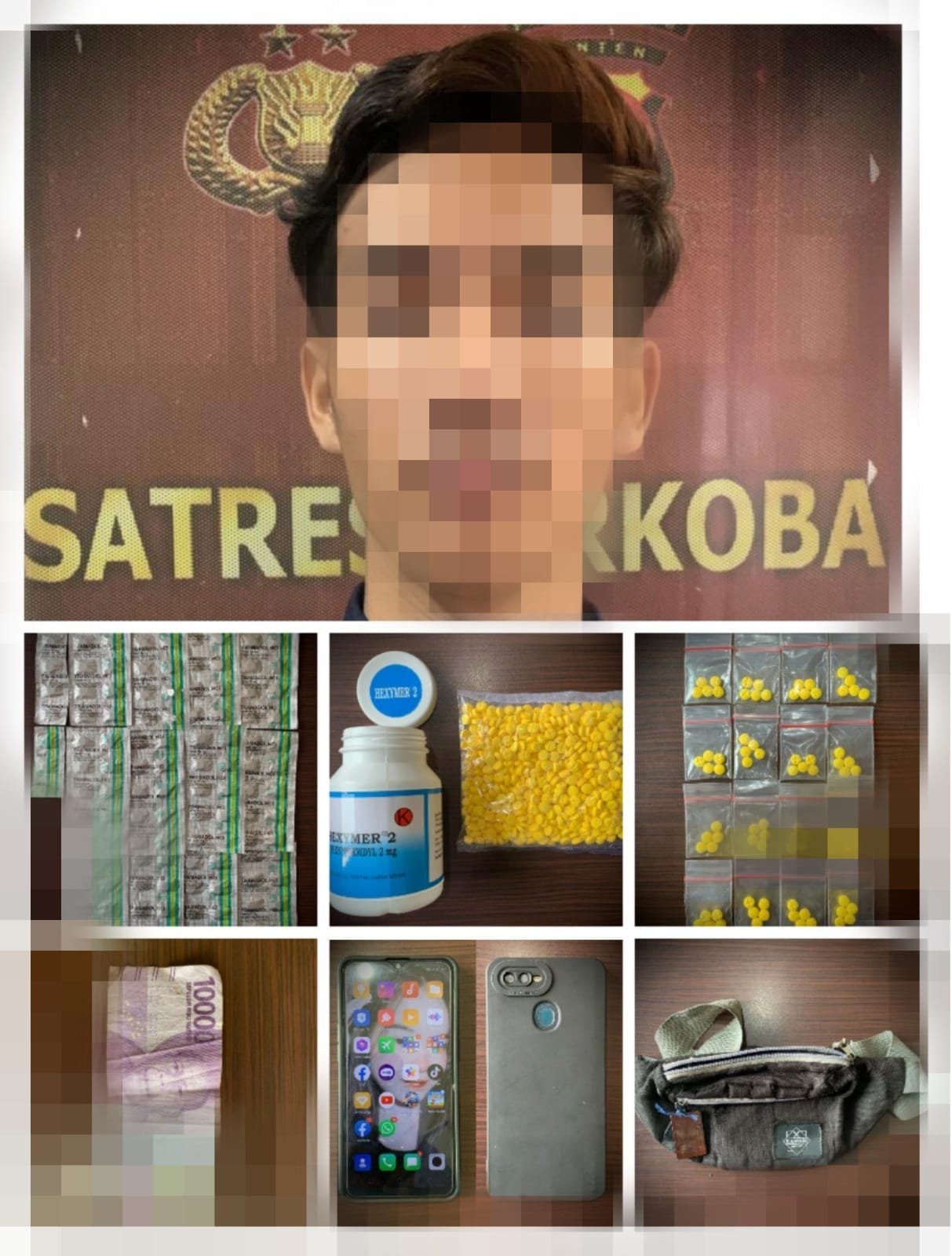“Dari tangan pelaku, polisi menyita barang bukti obat keras ilegal atau tanpa resep dokter sebanyak 780 butir merek Hexymer dan 128 butir merek Tramadol HCI. Selain itu, polisi menyita satu unit telepon seluler yang digunakan untuk bertransaksi, dan sebuah tas hitam untuk menyimpan obat keras ilegal, serta uang hasil penjualan sebesar Rp10.000,” kata Ilman.