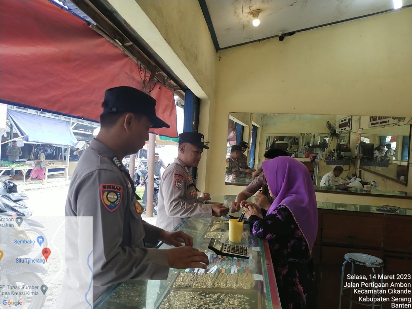Dalam kegiatan tersebut, dua personel Polsek Cikande Bripka M Rohibi dan Bripka Dedi yang melaksanakan patroli menyambangi pasar tradisional Banjar Cikande dan melakukan dialog dengan masyarakat yang ditemui terkait keamanan dan ketertiban masyarakat dan agar waspada tindak kejahatan. Selasa (14/3/2023)