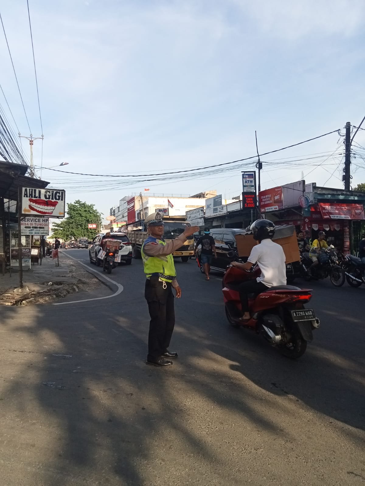 Dalam pelaksanaan tugasnya, anggota Unit Lalu Lintas Aiptu Slamet R. dari Polsek Balaraja turun langsung ke lapangan untuk melakukan pengaturan dan rekayasa arus lalu lintas guna mengurai kepadatan serta mencegah terjadinya kemacetan parah.