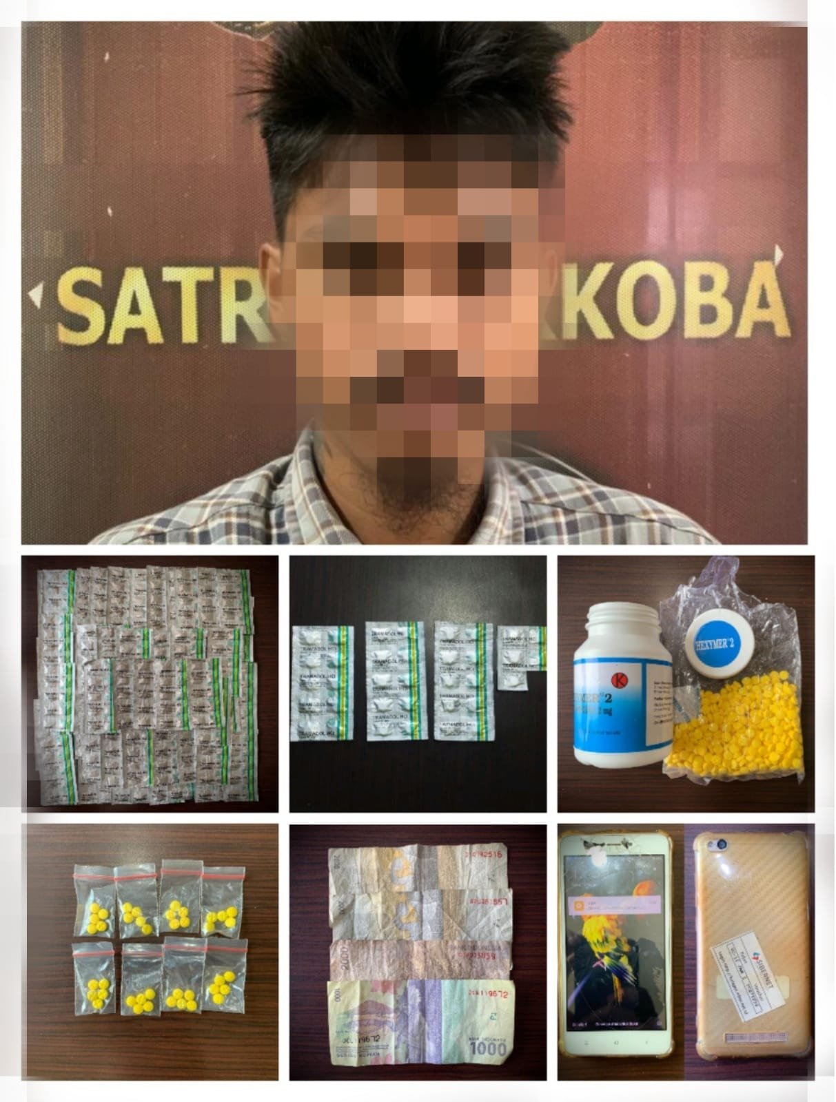 “Petugas melakukan penggeledahan badan serta tempat ditemukan barang bukti berupa obat tablet warna kuning berlogo MF (Hexymer) sebanyak 540 butir, dan obat tablet merk TRAMADOL HCI sebanyak 985 butir, satu buah HP merk Xiomi warna Putih yang kesemuanya tersimpan di tempat duduk depan rumah dan di temukan uang hasil penjualan obat-obatan sebesar Rp.7.000 di dalam saku celana,” tambahnya.