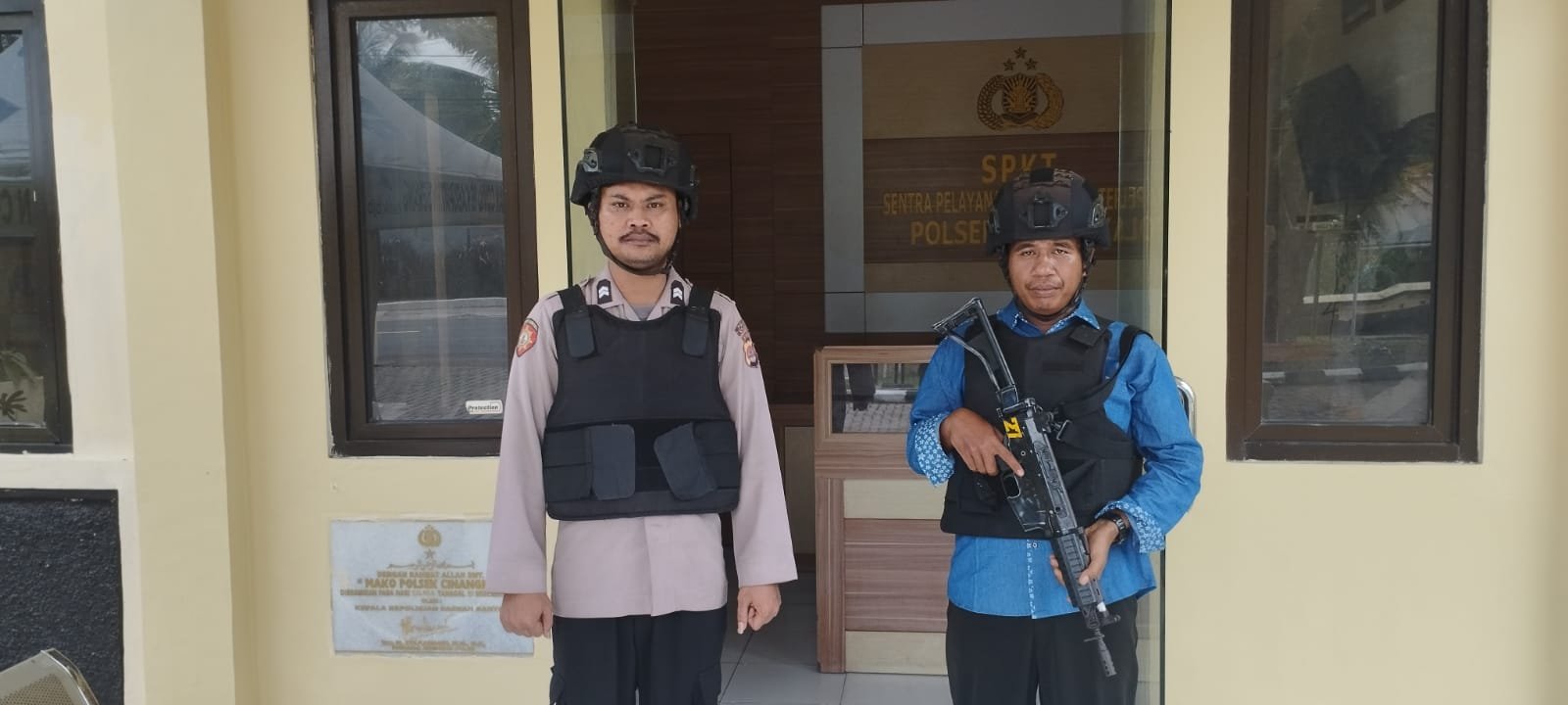 “Anggota piket jaga Polsek Cinangka melaksanakan Sispam Mako dilengkapi dengan bodyvest, helm kevlar, dan senjata api salahsatu upaya peningkatan kemanan mako guna mencegah hal-hal yang tidak dapat di duga selama pelayan berlangsung.