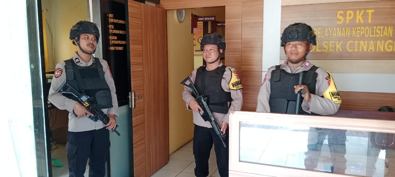 “Anggota piket jaga Polsek Cinangka melaksanakan Sispam Mako dilengkapi dengan bodyvest, helm kevlar, dan senjata api salahsatu upaya peningkatan kemanan mako guna mencegah hal-hal yang tidak dapat di duga selama pelayan berlangsung.